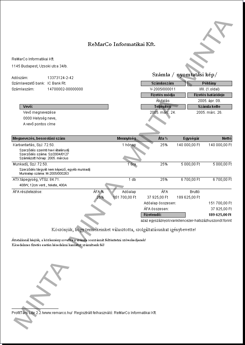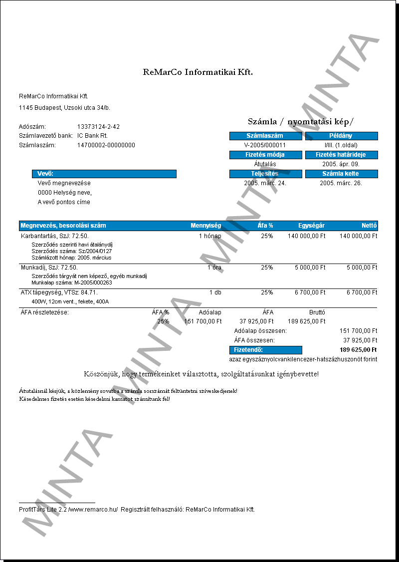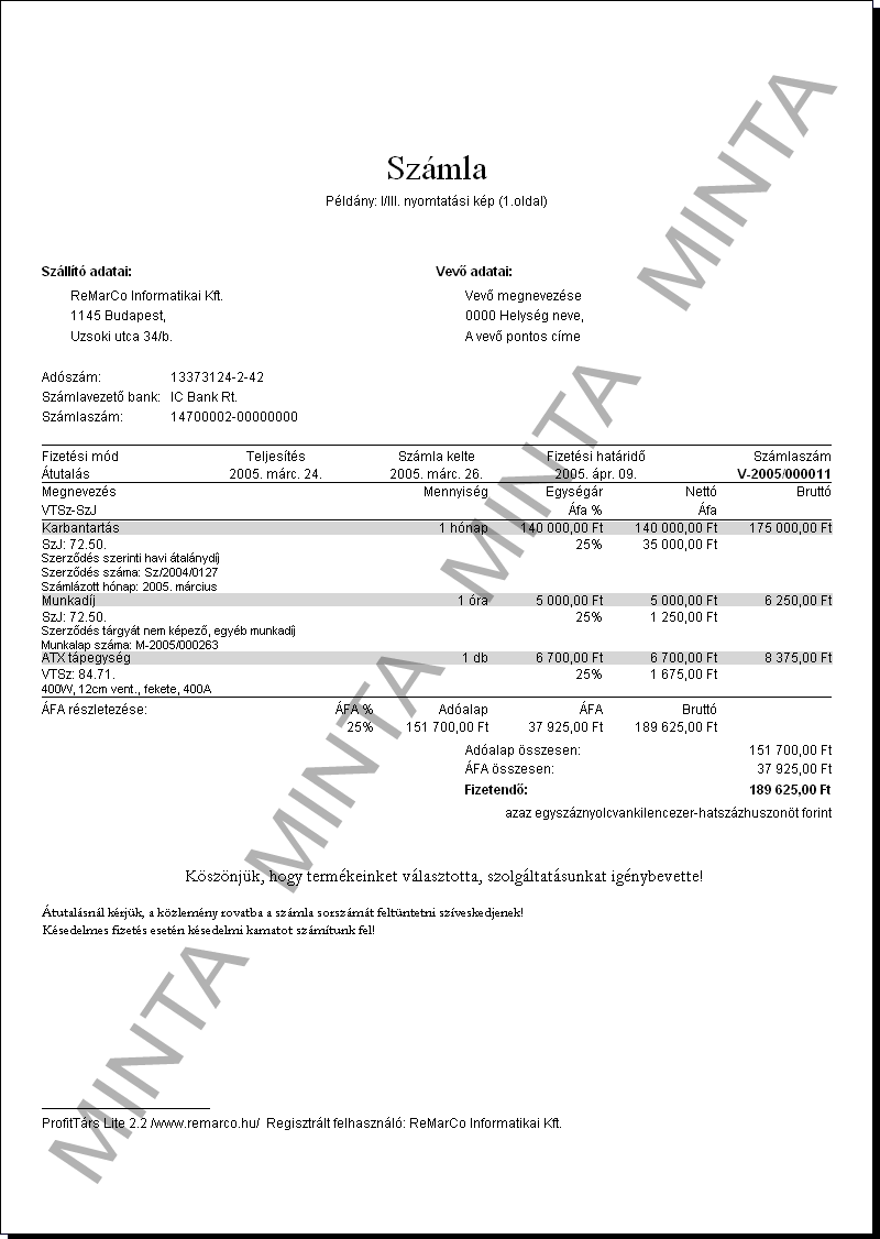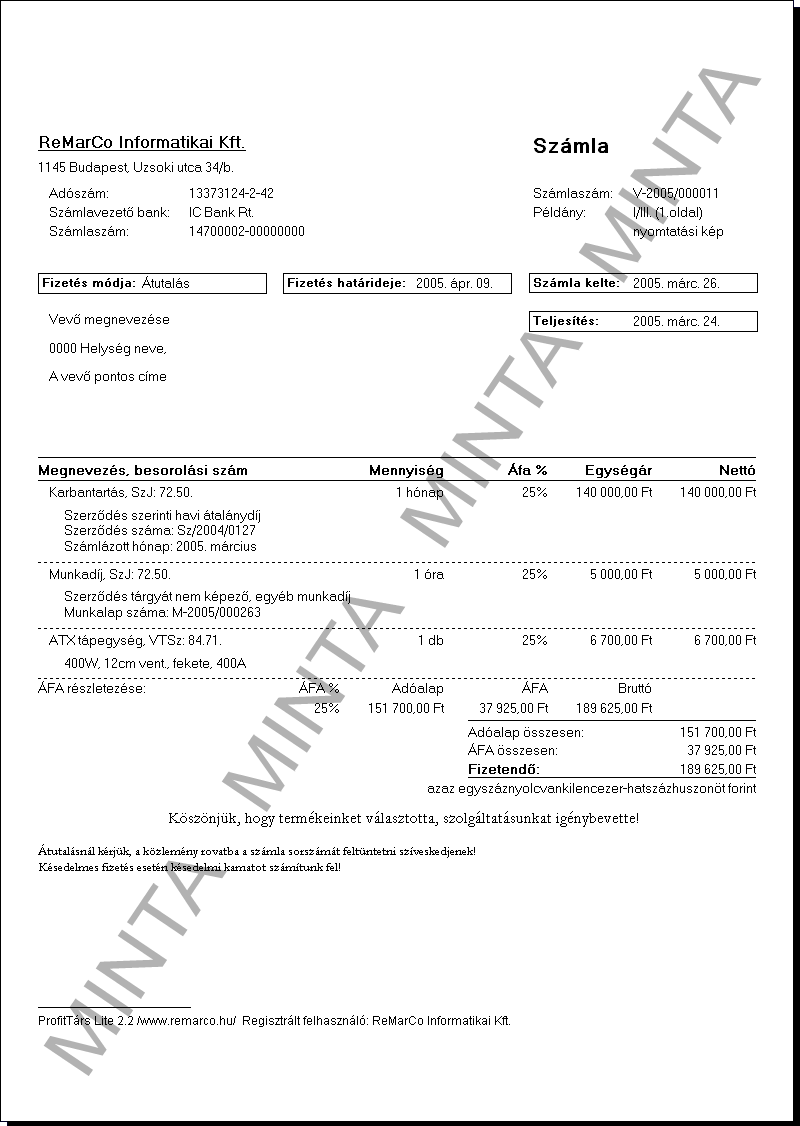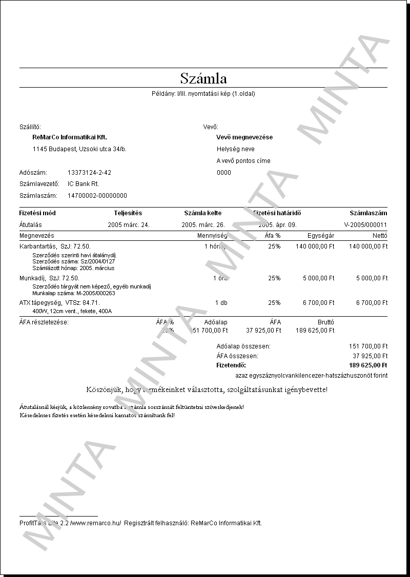 KiemeltBeépített számlaformátum, az alapprogram része (felár nélkül, szabadon választható). Használatával mindegyik számla 3 eredeti példányban nyomtatható, melyekről, ha szükséges, tetszőleges számú másolatot készíthet. Nagyításhoz kattintson ide! |